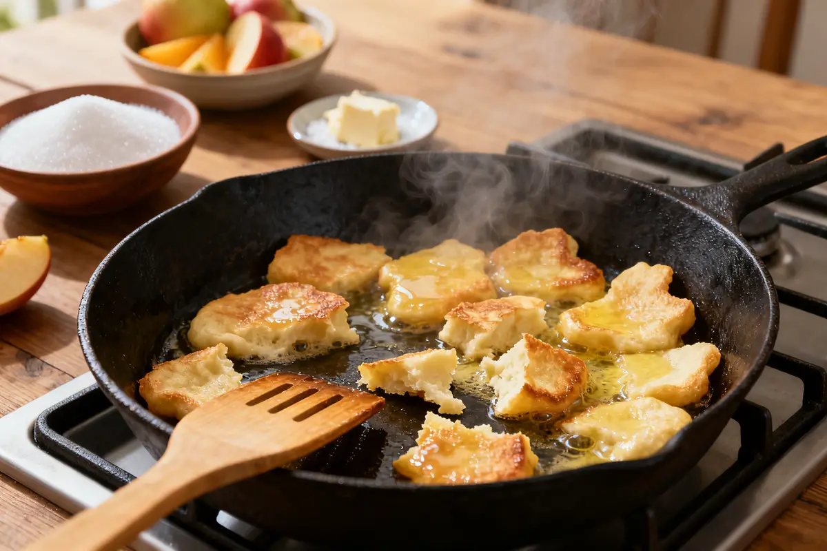 Quand la pâte commence à prendre, vous pouvez la brouiller avec une spatule. Le but n’est pas de former une crêpe ronde, mais de créer des morceaux irréguliers qui dorent chacun à leur rythme. Cette étape apporte tout le charme de ce plat familial : une multitude de morceaux dorés, au parfum de beurre chaud.