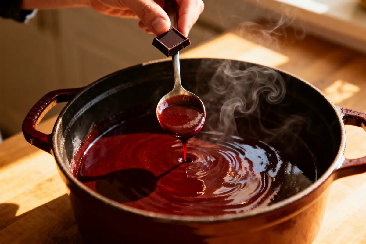 Ils prélèvent une louche de sauce chaude. Ils y font fondre le chocolat, puis reversent le tout dans la cocotte. Ensuite, ils remuent doucement. Ce geste final ajuste les arômes et la texture en toute discrétion.